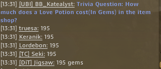 On each day from 8/8 through 8/12 I will post a Trivia Question in Global Chat some time between 12PM PST and 3PM PST. The first 5 people to answer correctly in Global Chat will win 25 Gems!